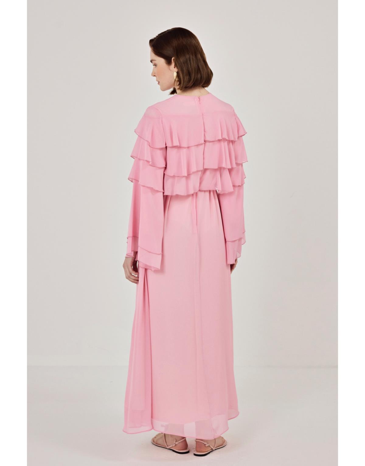 Şifon kumaşın hafif ve akışkan yapısıyla tasarlanan bu elbise, zarif ve dengeli bir siluet sunar. İnce dokusu hareketle birlikte yumuşak bir form kazanırken, iç astarı sayesinde konforlu ve güvenli bir kullanım sağlar.