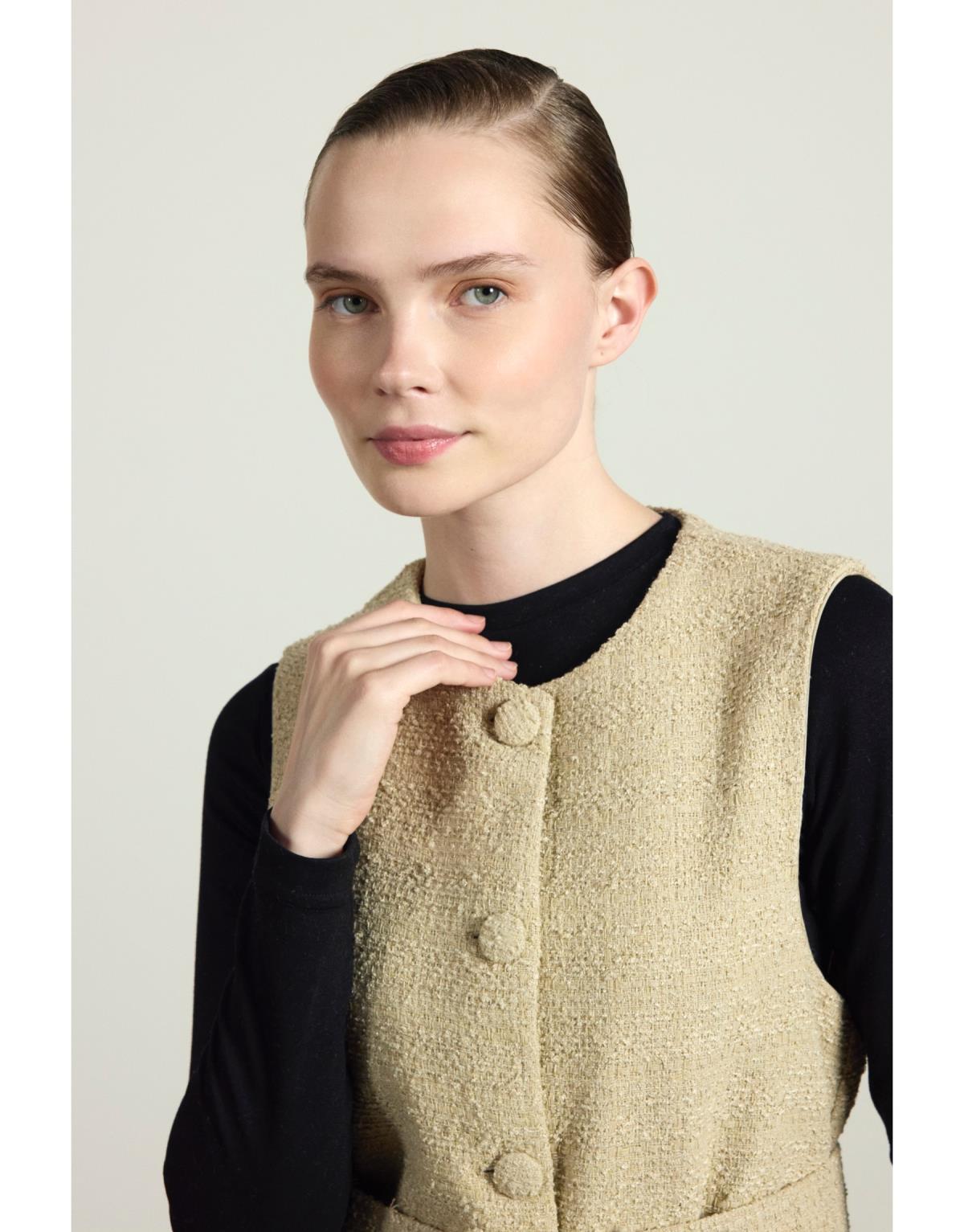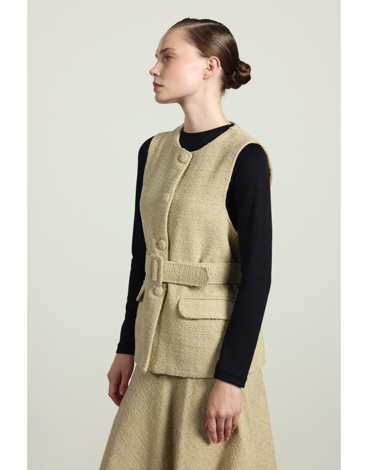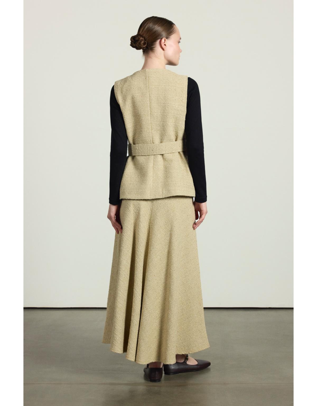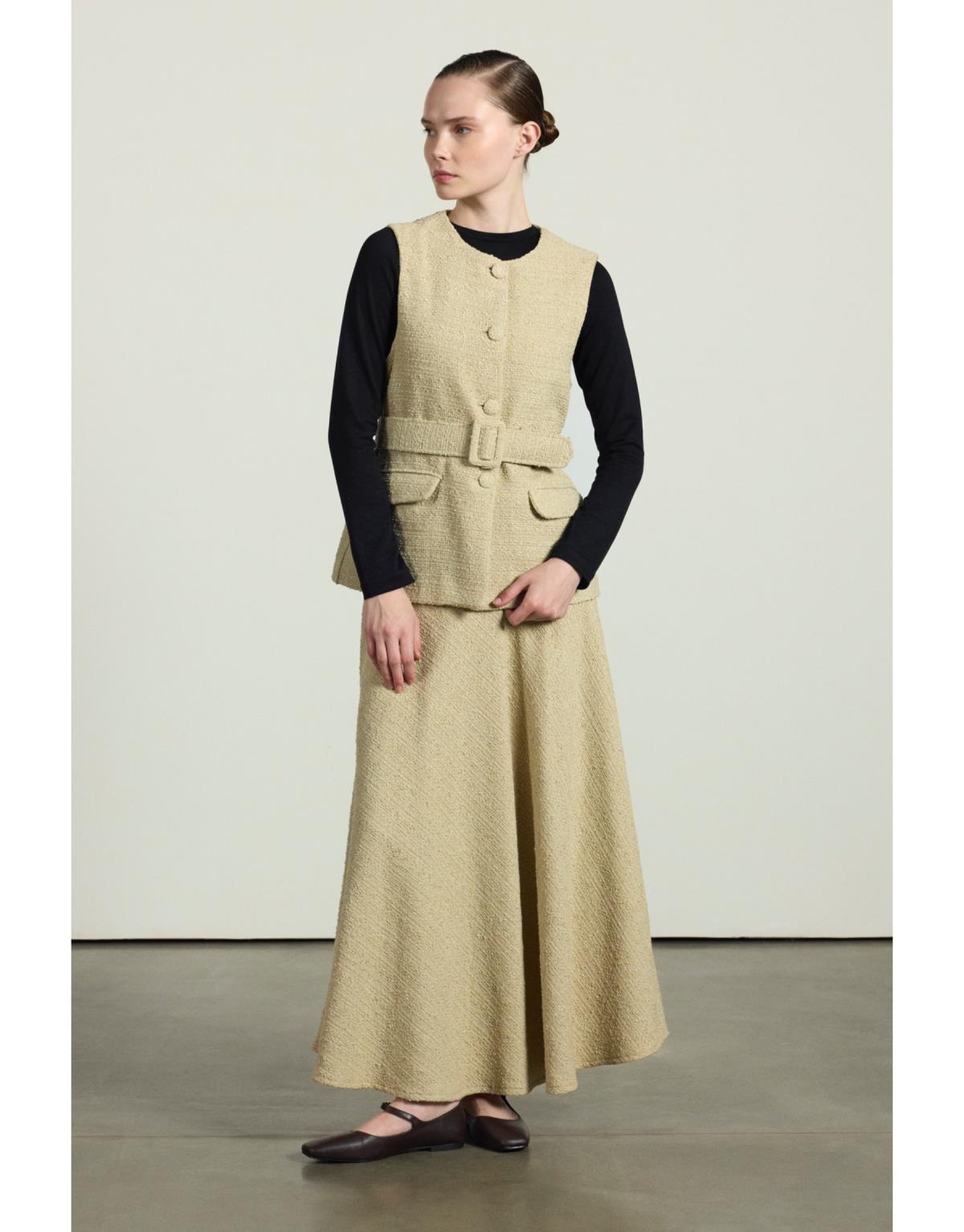 Kemer ve düğme kapamalı etek ve yelekten oluşan ikili takım. Astarlıdır.