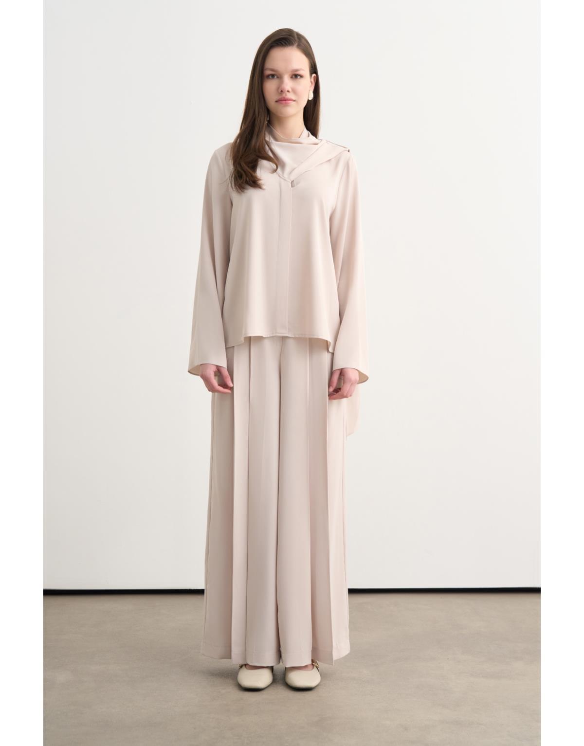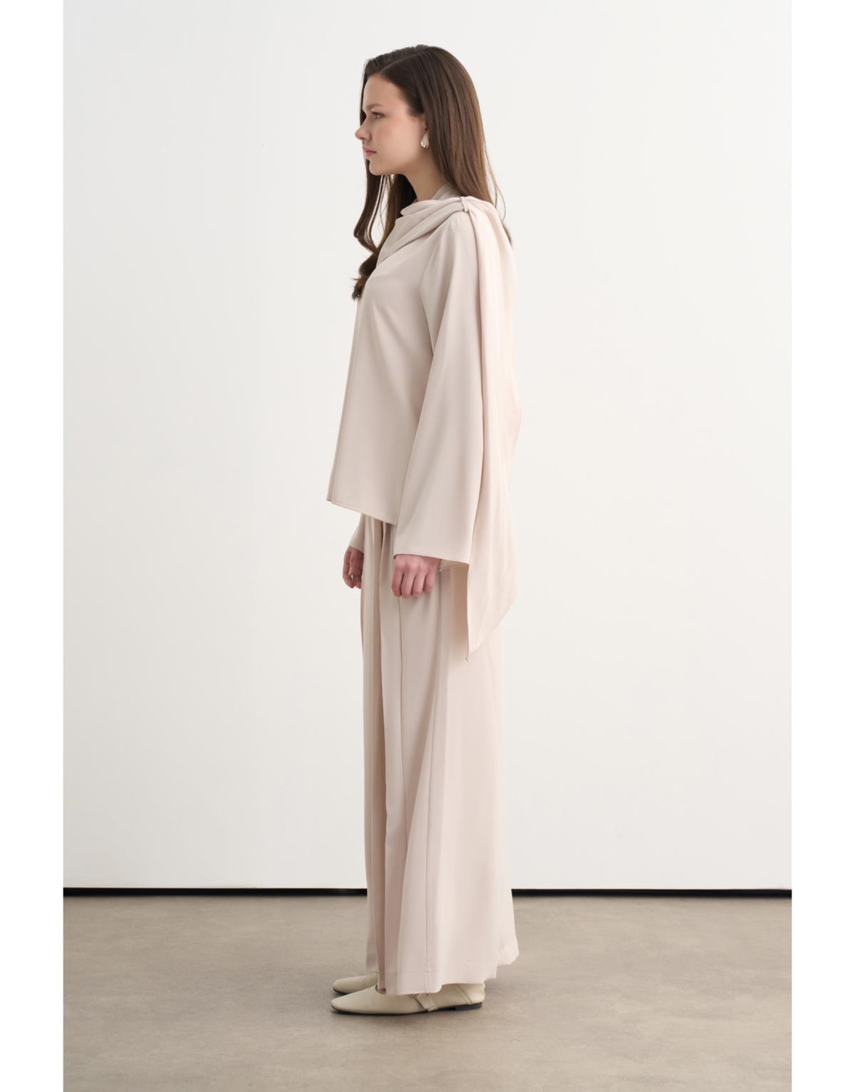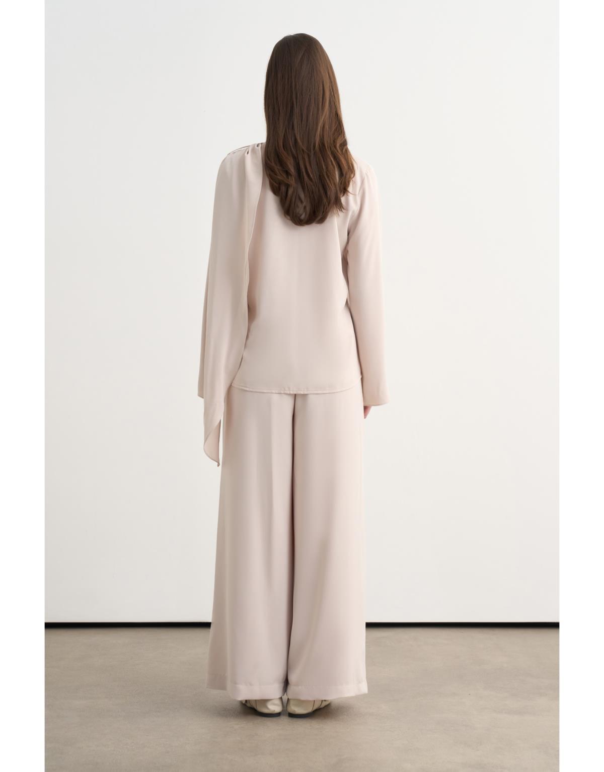 Saten kumaşın akışkan dokusuyla tasarlanan bu ikili takım, günün her anına uyum sağlayan modern ve net bir siluet sunar. Hafif parlak yüzeyiyle zarif bir duruş sergilerken, konforlu kesimi sayesinde hareket özgürlüğü sağlar. Gömlek ve pantolon uyumu, güçlü ama abartısız bir stil oluşturur.