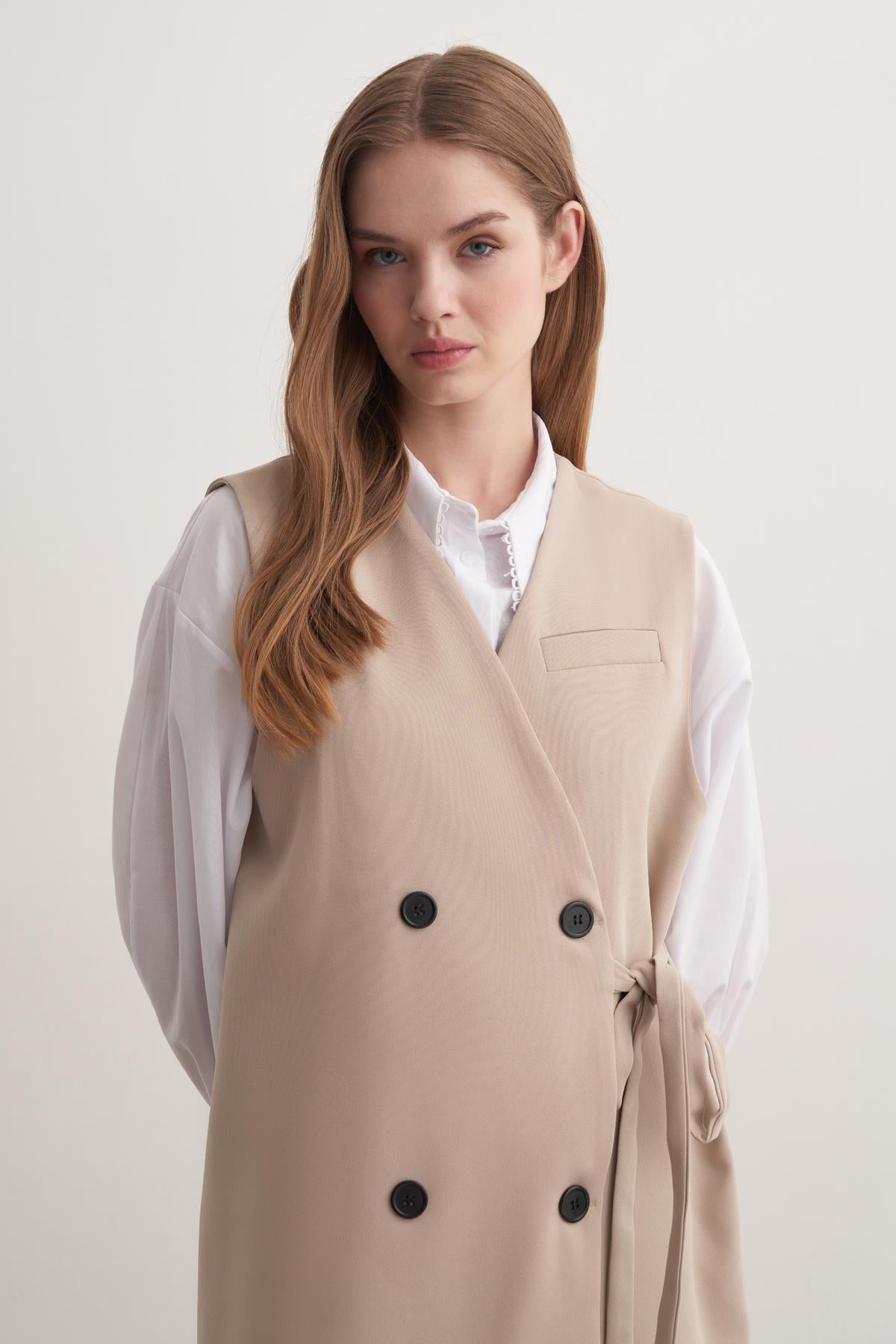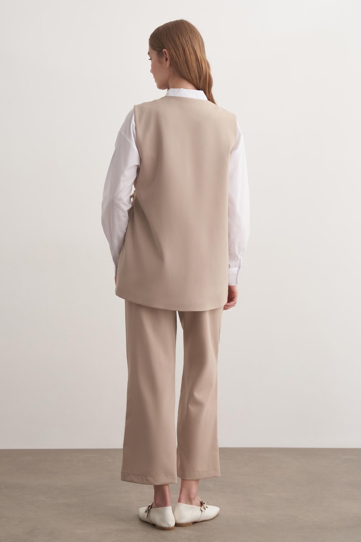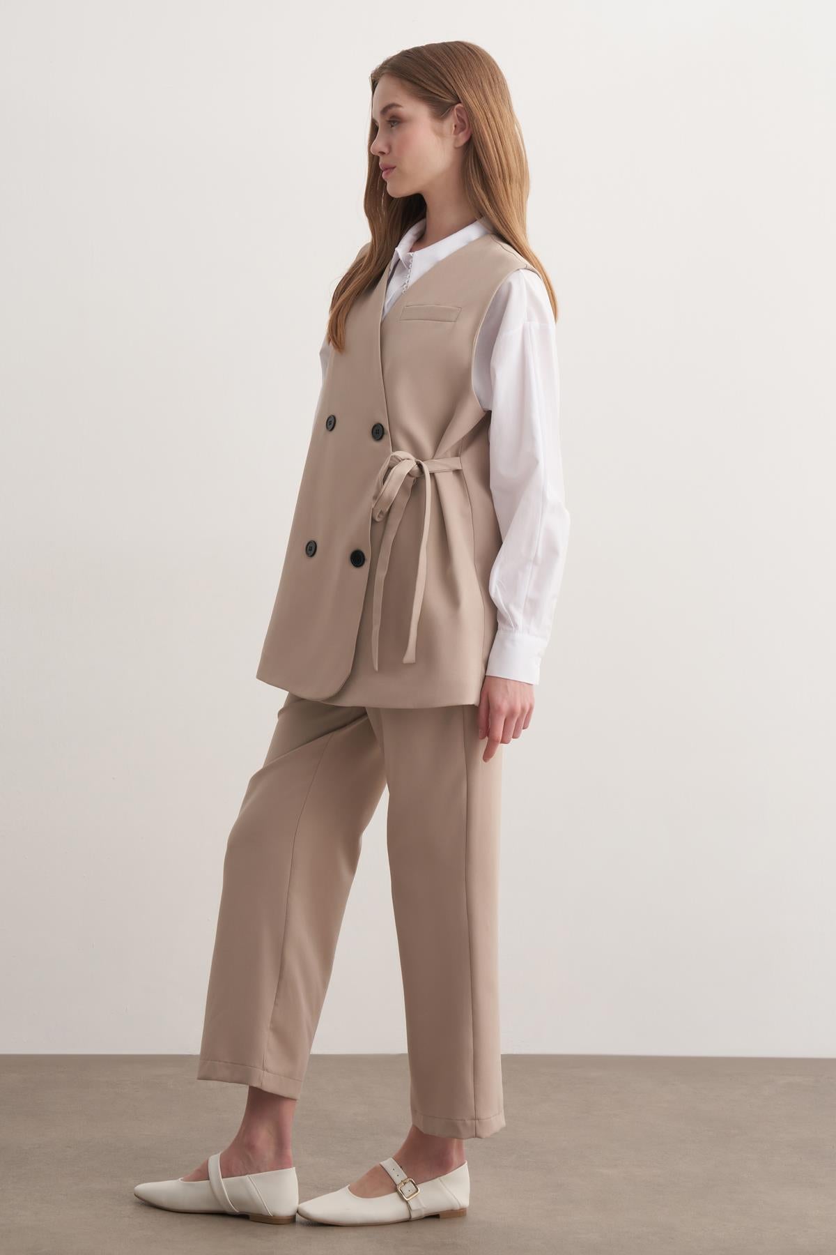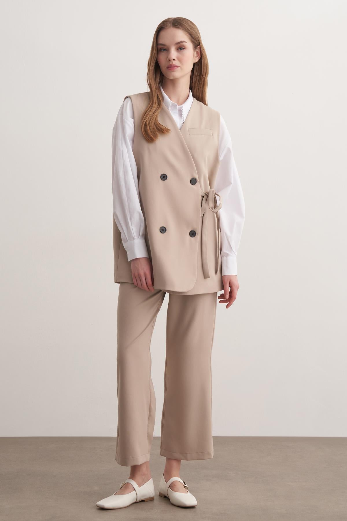 Önü düğme ve bağlama detaylı pantolonlu takım